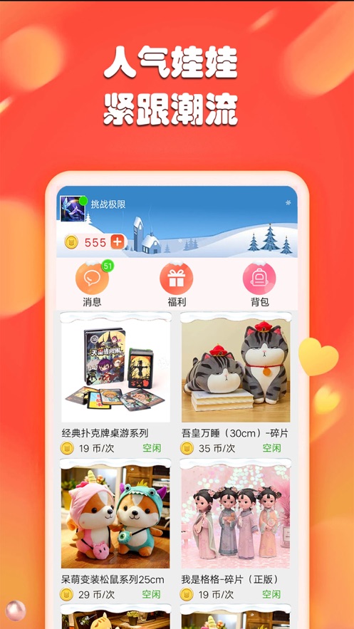 抓娃娃应该是每个女孩都挪不动脚的游戏吧,每次和男朋友或者跟好朋友出去玩,看见抓娃娃机里面布娃娃就忍不住想去参与一把,可每次自己都抓不到还浪费了很多钱,甚至有时候还抱怨男朋友抓不到,这款游戏不仅能满足你抓娃娃的快感,还能体验到游戏的乐趣哦。
