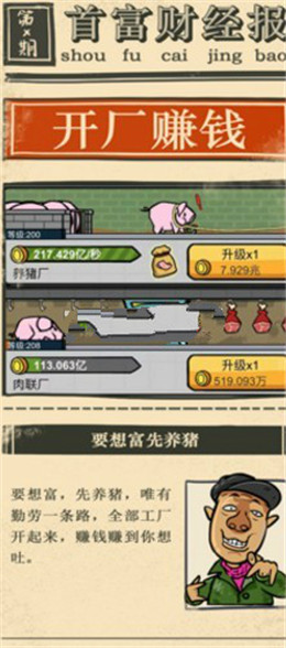 2.游戏就是点击收购的企业,然后系统会自动给你计算收益,每一段时间都会在囊中。