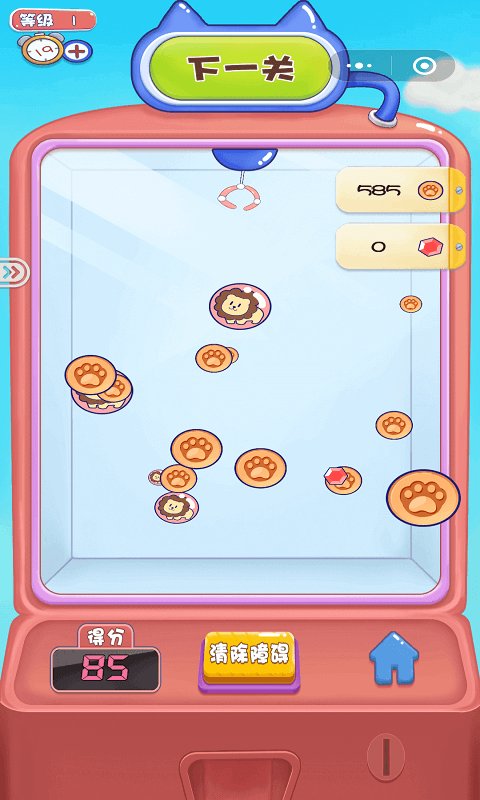 这款游戏的操作还是比较简单的,玩家只需要把握好时间,成功的抓到娃娃就可以了,关卡会有一些障碍会阻挡你的爪子,所以玩家可以使用一些清除障碍的道具来进行清理,更好的完成任务。