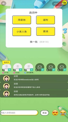 你画我猜猜猜在这款游戏中,你将和你的朋友通过你画我猜的方式展开各种互动游戏,题目非常的多,玩法也很新颖,不同的方式能够给你带来不同的笑料,是一款很适合朋友之间一起玩耍的游戏,同时你还可以单独玩耍,通过这款游戏随机匹配的队友来认识到更多的新朋友。