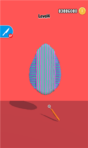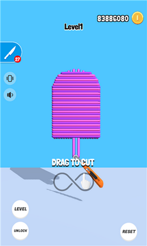 游戏总体来说不是很难,每一个人通过玩游戏都会喜欢上的,不会有厌烦的感觉,对下一个关卡都充满好奇,而且能在闯关的过程当中和橡皮筋一起决斗,看你能不能很顺利的将它们切割开。记得要从多个角度去切割哦,这样才能完成任务。