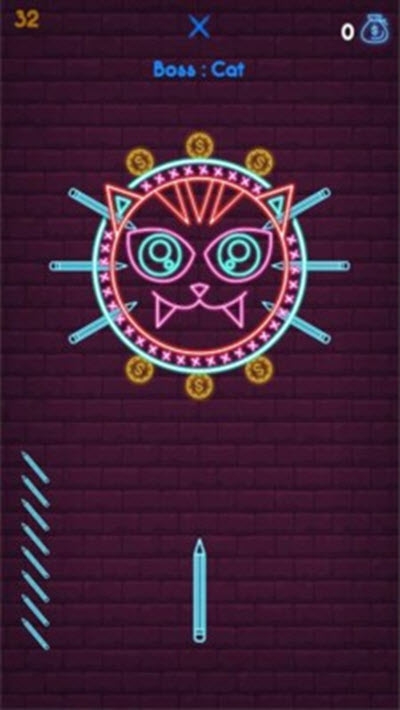 霓虹灯投掷,你一定玩过各种各样的弹射游戏吧,那你有没有玩过霓虹灯弹射游戏呢?在这里你需要不断的把你的霓虹灯扔出去,让它准确的插在靶子上。靶子是一直在旋转着的,你一定要注意,在你扔之前,你需要对他做一个预判。