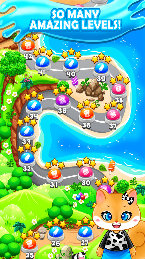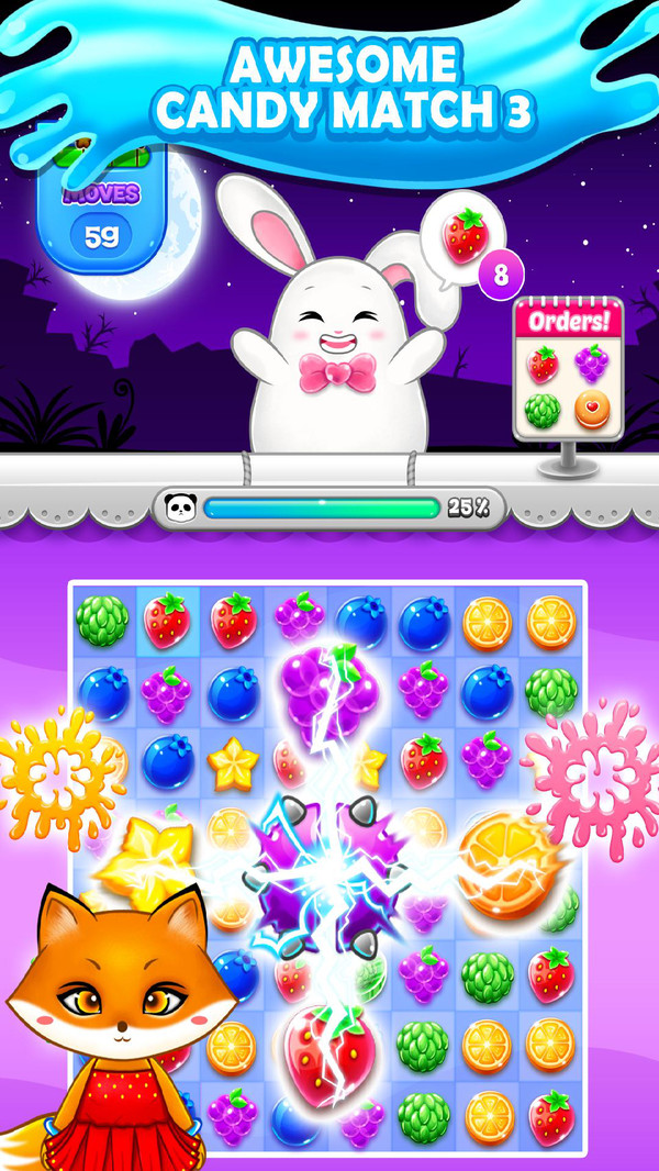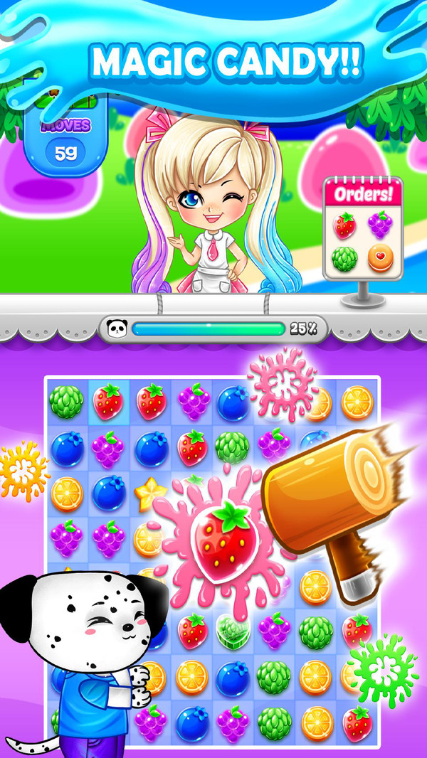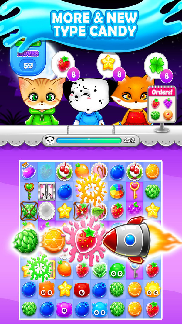 糖果甜果爆炸游戏中玩家将要体验一个非常解压的消除小游戏,经典的消除玩法可以让每个玩家轻松的上手,在这里,你将要移动这些甜美的糖果,将三个或三个以上的相同的糖果放在一条线上,这样就可以让它们消除了,在它们消除的瞬间,你可以看到非常炫酷的特效,这里还有很多的道具可以帮助你大面积的消除。